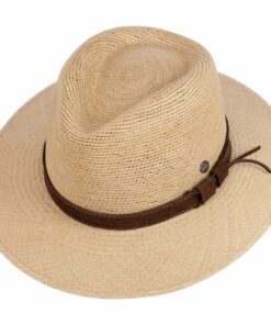 Panama straw is the summery material of choice for this trilby and has been carefully woven using traditional handcrafting methods. The straw hat with a characteristically shaped crown and brim feels airy and lightweight atop the head and flatters the wearer with its plain-coloured design. This is complemented by a stylish, colourfully striped grosgrain ribbon trim with brand pin, which adds the visual finishing touch.