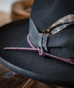 Modern Felt Hat, This is a medium height centre dent with 7cm / 2.75 in overwelt pencil roll brim. It features 38 mm modern grosgrain hatband with a double back bow & leather cord.