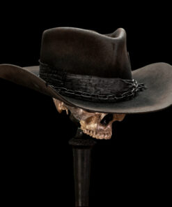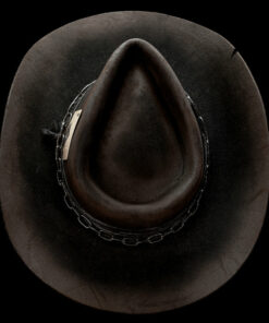 Inspired by the legendary frontman of Motörhead, this black European hare teardrop hat with a cowboy curl embodies raw attitude and timeless rock spirit. Ruggedly bold, it features heavy distressing, strong lines, and is finished with a distressed black fabric wrap, a heavy black chain, and an Ace of Spades card — the ultimate symbol of rebellion.
